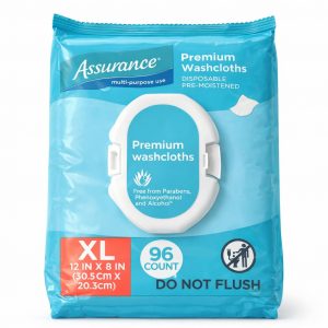 Assurance Premium Disposable Washcloths, XL 12 x 8 in, Pre-Moistened, Alcohol-Free, Paraben-Free, with Aloe & Vitamin E, 96 Count