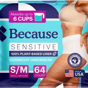 Because Adult Incontinence Underwear for Sensitive Skin – Women – Premium Overnight Disposable Briefs, Anti Odor – White, Small/Medium – Absorbs 6 Cups – 64 Count (4 Packs of 16)
