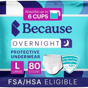 Because Overnight Absorbency Pull Ups – Adult Disposable Incontinence Underwear, Extra Absorbent Nighttime Briefs for Men and Women, White, Large, 80 Count (4 Packs of 20)