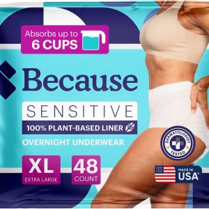 Because Adult Incontinence Underwear for Sensitive Skin – Women – Premium Overnight Disposable Briefs, Anti Odor – White, X-Large – Absorbs 6 Cups – 48 Count (4 Packs of 12)