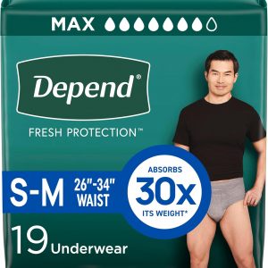 Depend Fresh Protection Adult Diapers, Incontinence Underwear for Men, Disposable, Maximum, Small/Medium, Grey, 19 Count, Packaging May Vary