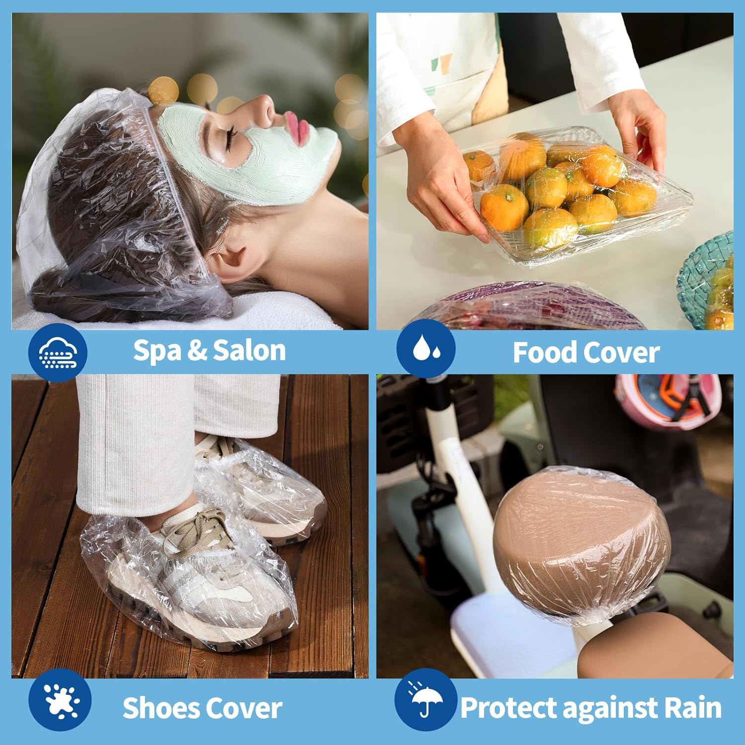 - Multipurpose Shower Caps: Fantastic shower cap for women, men, girl. Perfect plastic caps for hair treatment, hair deep conditioning, hair dyeing. Organize and protect your hair when doing face care, spa, salon, having spray tan, cooking, cleaning house, painting wall. Ideal guest supplies for hotel, beauty salon, workshop. Also great choice for covering food like fruit and dough, shoes, hat, bicycle seat, remote control, and so on.