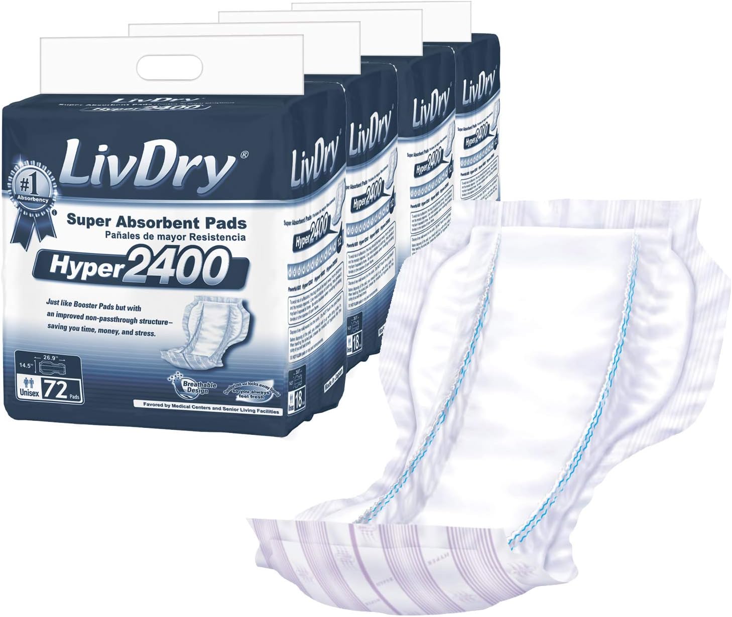 LivDry High Absorbency Pad Insert FOR Incontinence Briefs and Adult Diapers, Women and Men, Hyper 2400 (72 Count)