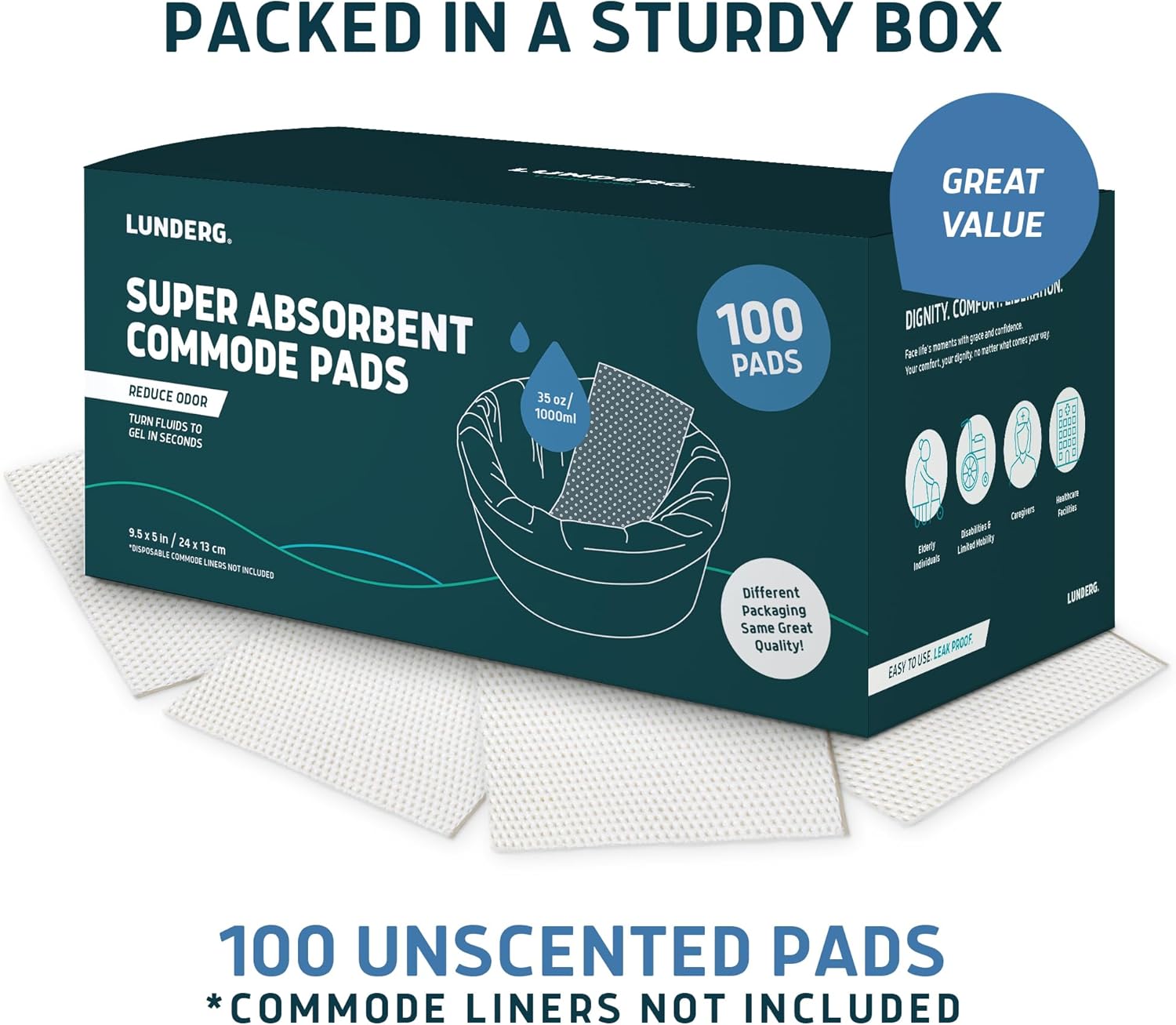 - Best Value – Lunderg pads are Medical Grade and come in a sturdy, durable box with 100 gel absorbent Pads. You save money when buying pads separately from toilet commode bags. Work great with Lunderg commode Liners or any brand of toilet liners!